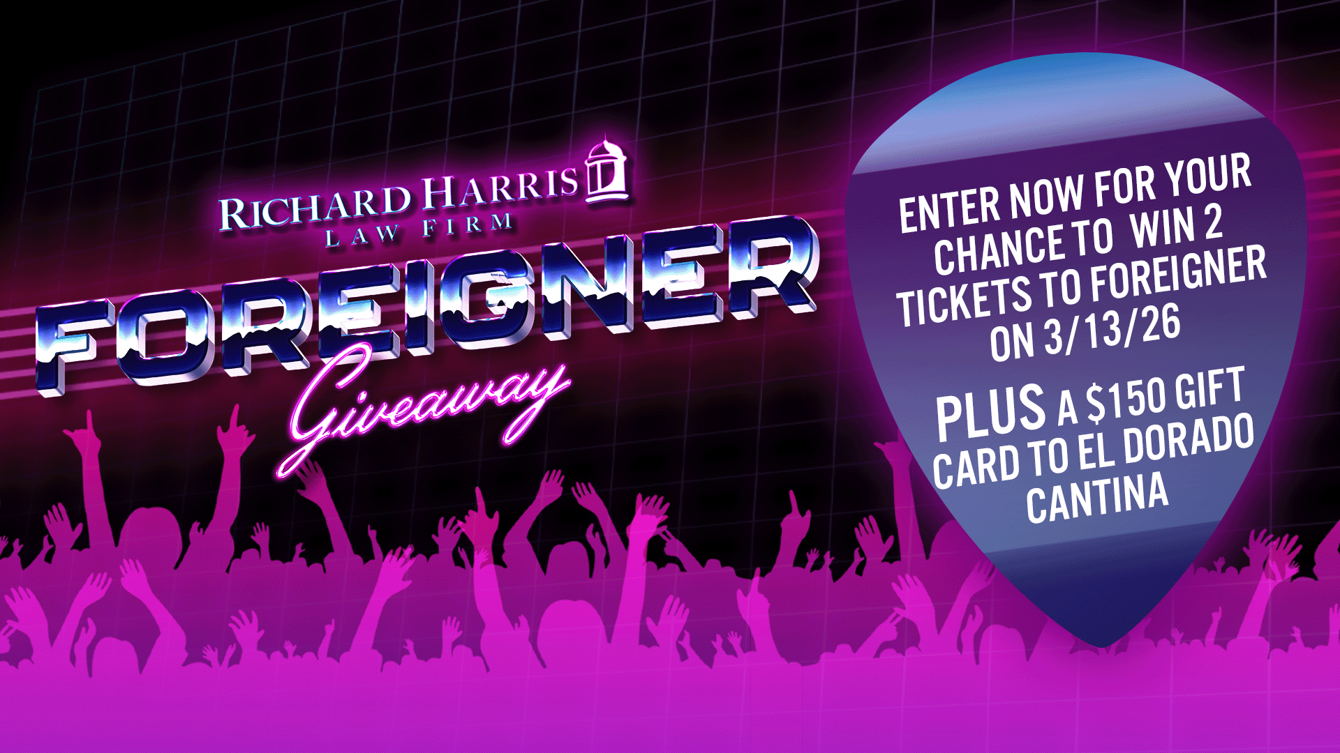 Richard Harris Law Firm is giving ONE lucky winner Two (2) tickets to the Foreigner concert at The Venetian Theatre in Las Vegas and $150 gift card for El Dorado Cantina!