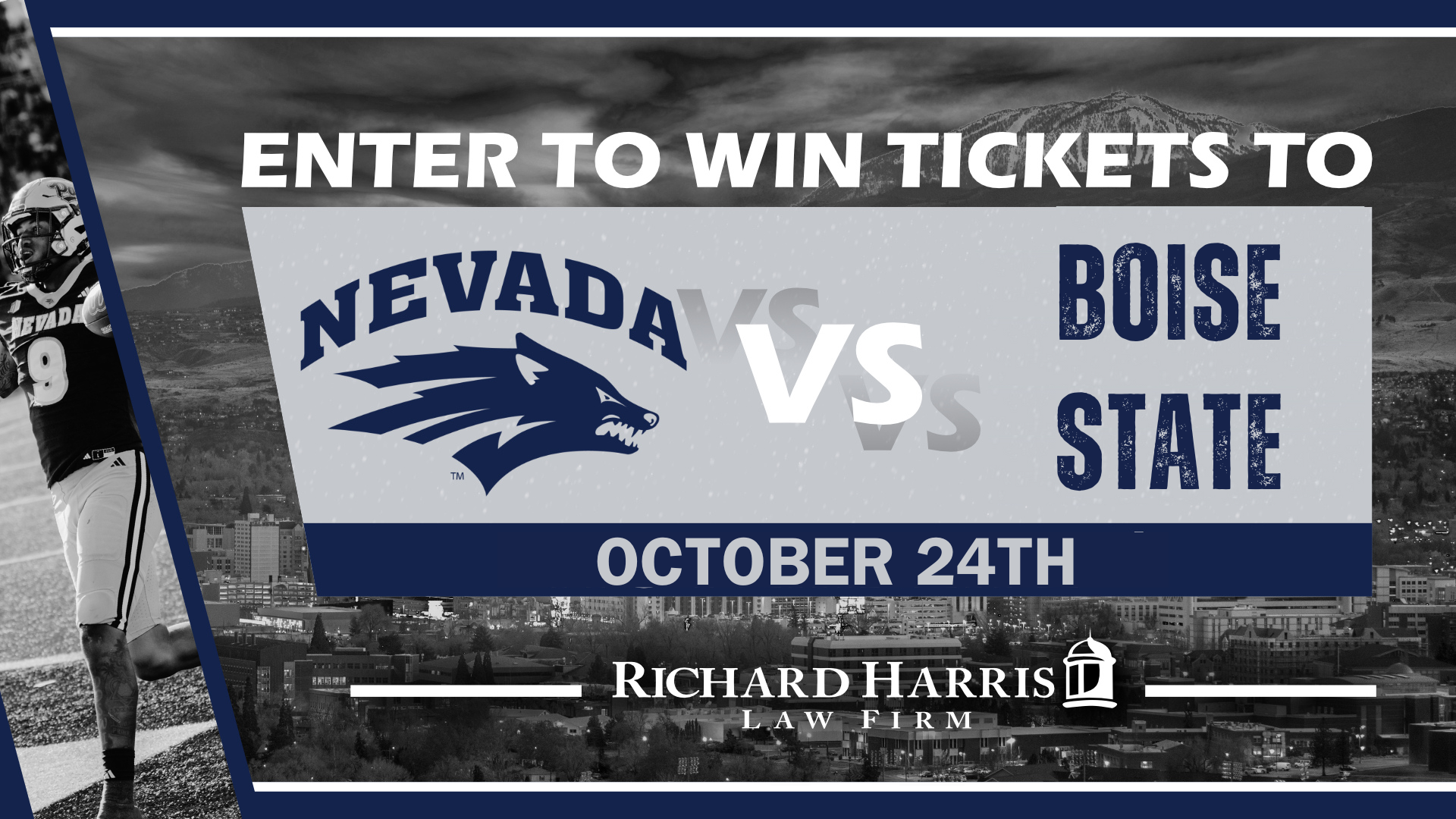 - Eligibility: This Campaign is open only to those who sign up at https://richardharrislaw.com/giveaways/nevada-vs-boise-state/. You must be 21 years or older as of the date of entry to be eligible to win. The Campaign is only open to legal residents of Nevada and is void where prohibited by law. The Campaign is subject to all applicable federal, state, and local laws and regulations. Void where prohibited.